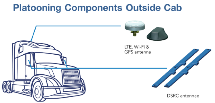 LTE and GPS Antennas. The Peloton platooning system includes an LTE antenna and a GPS antenna, connected to the back of the truck’s cab on the outside. Hermetically sealed for outdoor use, the LTE antenna supports communication to the cloud and GPS antenna supports truck positioning and gap control between platooning trucks.
