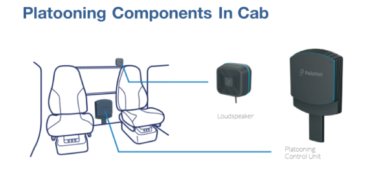 Speaker. A dedicated speaker, mounted behind the driver’s head on the back inside wall of the cab, lets drivers hear alerts and use voice communication with their platooning partners.